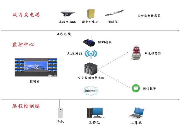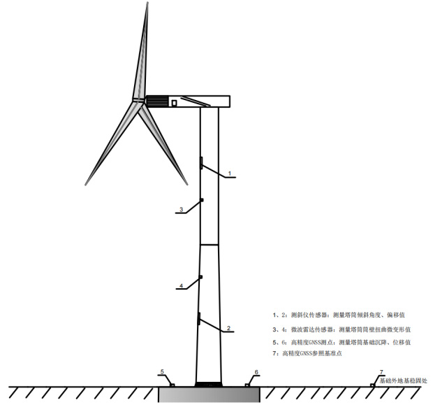 本方案使用高精度GNSS接收机、微波雷达、测斜仪三种传感器分别对风塔塔基的沉降、塔筒内部的扭曲变形、塔筒的倾斜状态进行实时监测,并配以监测工控主机、变形监测软件、网络交换机、无线通讯模块、接线盒、传输线缆等设备对监测数据进行实时采集、存储、分析,从而达到对整个风塔的安全稳定性进行实时监测、预警分析的目的。